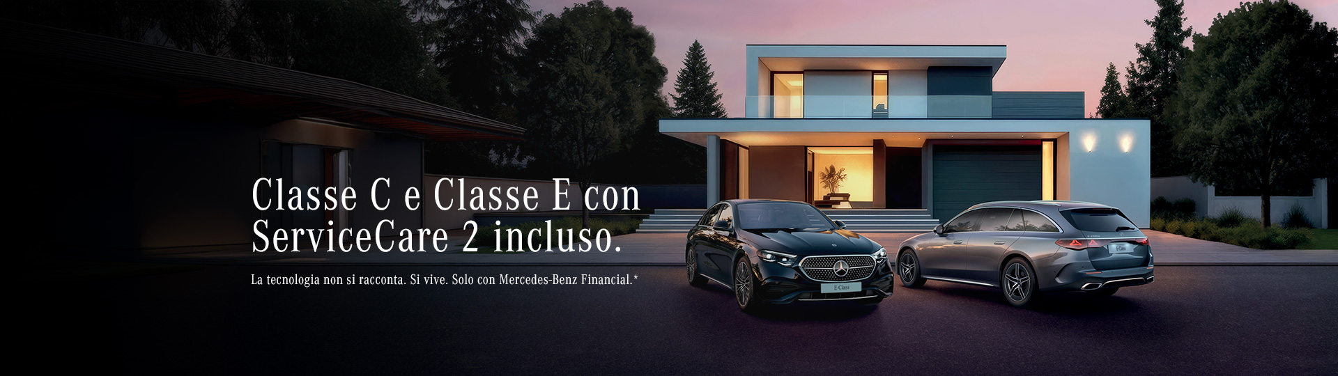 [a] L’offerta del pacchetto manutenzione ServiceCare 2 (2 Tagliandi), è valida su tutta la gamma Classe C (BR206) e Classe E (BR214) per vetture disponibili presso le Concessionarie ed è soggetta a disponibilità limitata per contratti entro il 30/06/2026 e immatricolazioni entro il 30/09/2026. Solo con finanziamento o leasing Mercedes-Benz Financial Services Italia S.p.A. L’offerta è cumulabile con altre iniziative in corso. I termini e le condizioni del ServiceCare 2 sono disponibili in Concessionaria e sul sito internet della Società alla sezione Trasparenza. Lista dei Concessionari aderenti su mercedes-benz.it. Messaggio pubblicitario con finalità promozionale.